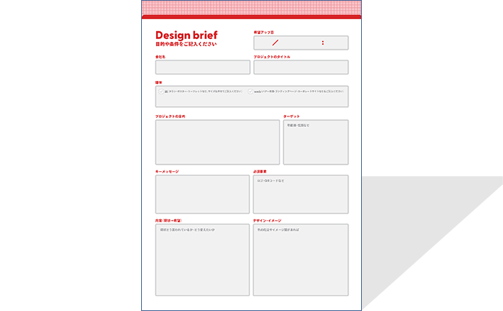 そこで有効なのが、目的・ターゲット・メッセージ・必須要素(ロゴや期限、入稿条件など)を1枚にまとめた「デザインブリーフ」を用意することです。
